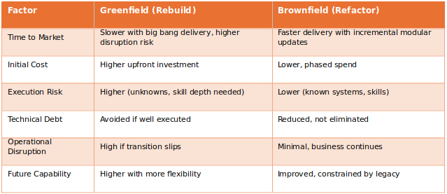 • What’s your time to market? If you need to move fast, then a full Greenfield rebuild isn’t going to be for you. But remember, however fast you need to move, a rushed job is likely to leave you in a worse position.